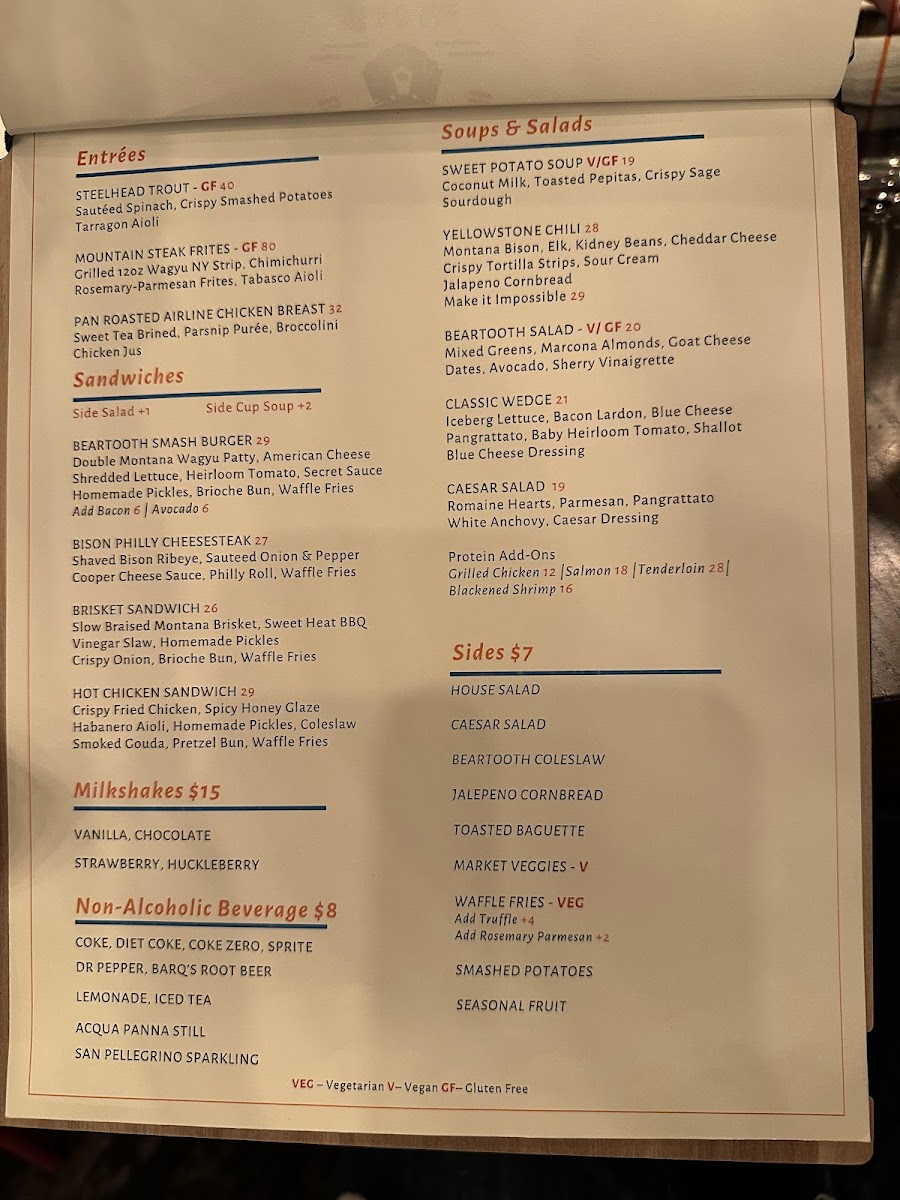 The Soups & Salads section is equally impressive, offering comforting options like the Sweet Potato Soup and Yellowstone Chili, which are perfect for warming up on a chilly Montana day. For lighter, fresher options, the Beartooth Salad, Classic Wedge, and Caesar Salad provide a crisp balance to the rich entrées, with the House Salad and Caesar Salad acting as versatile sides for any meal.