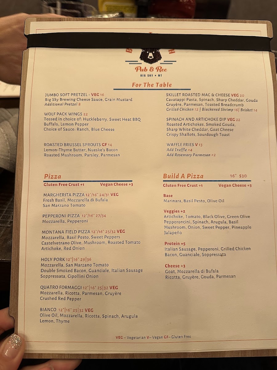 Be sure to check out the For The Table section, where you’ll find shareable favorites like the Jumbo Soft Pretzel, perfect for snacking with friends, and the flavorful Wolf Pack Wings. The Roasted Brussel Sprouts and Skillet Roasted Mac & Cheese offer a cozy, indulgent vibe, while the Spinach and Artichoke Dip adds a creamy touch to the mix. The menu also includes tasty pizzas such as the Margherita Pizza and Pepperoni Pizza, as well as more adventurous choices like the Montana Field Pizza and Holy Pork, providing a fun variety of options for pizza lovers.